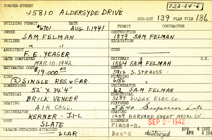 15810 Aldersyde Drive Shaker Heights, OH 44120 PARCEL ID: 732-24-006 Building Permit Date: 08-01-1941 Neighborhood: Onaway Owner: Felman, Sam Builder: Felman, Sam Architect: Yeager, Floyd E. Estimated Cost: 19000 Date Completed: 03-10-1942 Kind: Single Dwelling and Garage (2) Material: Brick Veneer Heating: Air Conditioned Roof: Slate Garage: attached 2 car Blueprints: no blueprints on microfilm |  |