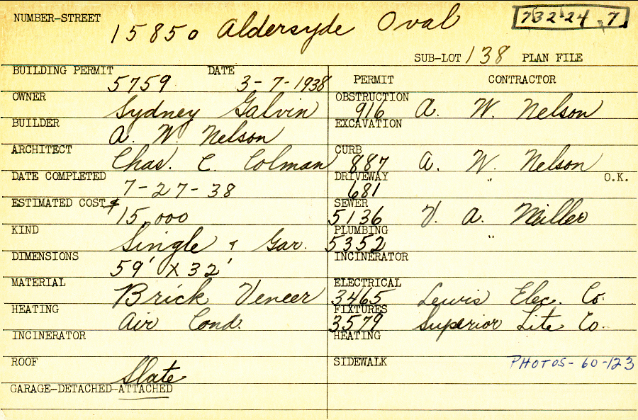 15850 Aldersyde Drive Shaker Heights, OH 44120 PARCEL ID: 732-24-007 Building Permit Date: 03-07-1938 Plan File Number: 1040 scanned, 9940 Microfilm Roll: Roll013, Roll#105 Neighborhood: Onaway Owner: Galvin, Sydney Builder: Nelson, A. W. Architect: Colman, Charles C. Estimated Cost: 15000 Date Completed: 07-27-1938 Kind: Single Dwelling and Garage Material: Brick Veneer Heating: Air Conditioned Roof: Slate Garage: attached |  |