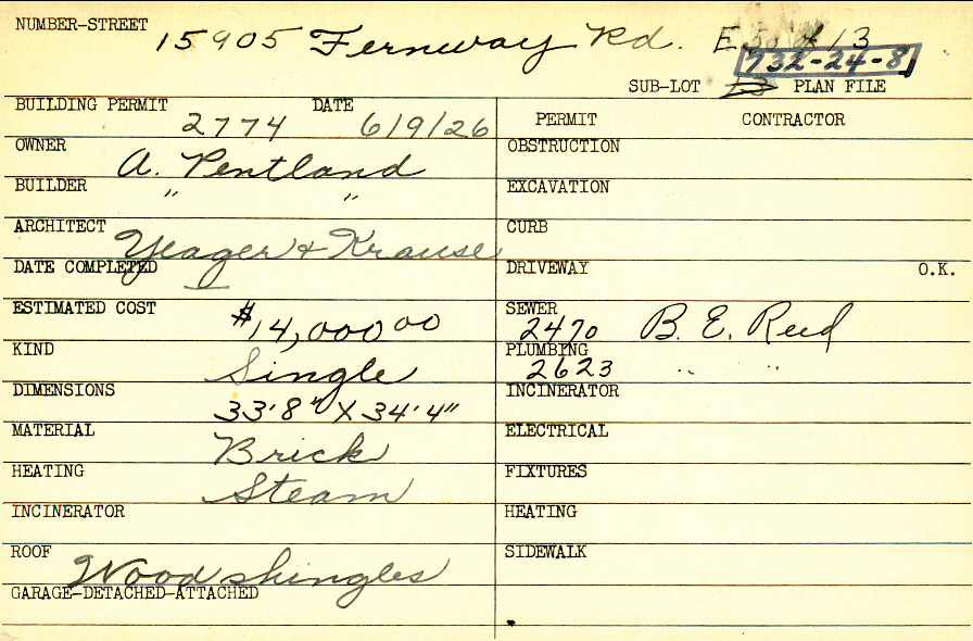 15905 Fernway Road Shaker Heights, OH 44120 PARCEL ID: 732-24-008 Building Permit Date: 06-09-1926 Plan File Number: 0 Neighborhood: Onaway Owner: Pentland, A. Builder: Pentland, A. Architect: Yeager and Krause Estimated Cost: 14000 Kind: Single, Single Residence or Dwelling Material: Brick Heating: Steam Roof: Wood Shingle Card Available: yes |