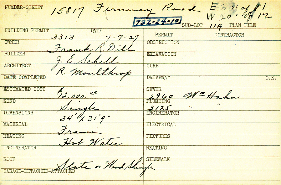 15817 Fernway Road Shaker Heights, OH 44120 PARCEL ID: 732-24-010 Building Permit Date: 07-07-1927 Plan File Number: 0 Neighborhood: Onaway Owner: Dill, Frank R. Builder: Schill, J. E. Architect: Moulthrop, Ray Estimated Cost: 12000 Kind: Single, Single Residence or Dwelling Material: Frame Heating: Hot Water Roof: Wood Shingle Card Available: yes |