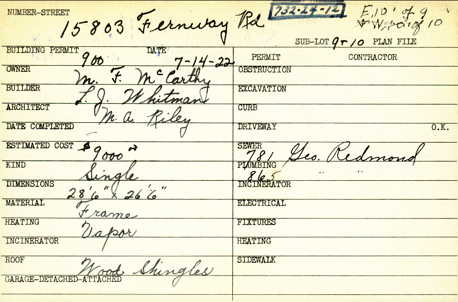 15803 Fernway Road Shaker Heights, OH 44120 PARCEL ID: 732-24-012 Building Permit Date: 07-14-1922 Plan File Number: 3760, 10040 Microfilm Roll: Roll#51, Roll#105 Neighborhood: Onaway Owner: McCarthy, F. Builder: Whitman, L. J. Architect: Riley, M. A. Estimated Cost: 9000 Kind: Single, Single Residence or Dwelling Material: Frame Heating: Vapor Roof: Wood Shingle |