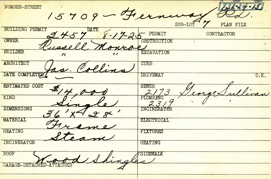 15709 Fernway Road Shaker Heights, OH 44120 PARCEL ID: 732-24-015 Building Permit Date: 08-17-1925 Plan File Number: 5448 Microfilm Roll: Roll#74 Neighborhood: Onaway Owner: Monroe, Russell Builder: Monroe, Russell Architect: Collins, Joseph Estimated Cost: 14000 Kind: Single, Single Residence or Dwelling Material: Frame Heating: Steam Roof: Wood Shingle |