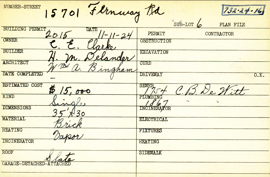 15701 Fernway Road Shaker Heights, OH 44120 PARCEL ID: 732-24-016 Building Permit Date: 11-11-1924 Plan File Number: 0 Neighborhood: Onaway Owner: Clarke, C. E. Builder: Delander, H. M. Architect: Bingham, William A. Estimated Cost: 15000 Kind: Single, Single Residence or Dwelling Material: Brick Heating: Vapor Roof: Slate Card Available: yes |