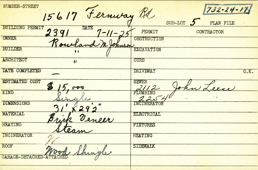 15617 Fernway Road Shaker Heights, OH 44120 PARCEL ID: 732-24-017 Building Permit Date: 07-11-1925 Plan File Number: 0 Neighborhood: Onaway Owner: Johnson, Rowland M. Builder: Johnson, Rowland M. Architect: Johnson, Rowland M. Estimated Cost: 15000 Kind: Single, Single Residence or Dwelling Material: Brick Veneer Heating: Steam Roof: Wood Shingle Card Available: yes |