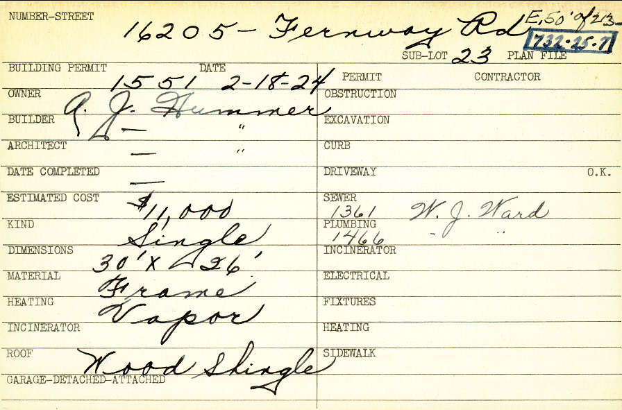 16205 Fernway Road Shaker Heights, OH 44120 PARCEL ID: 732-25-007 Building Permit Date: 02-18-1924 Plan File Number: 0 Neighborhood: Onaway Owner: Hummer, A. J. Builder: Hummer, A. J. Architect: Hummer, A. J. Estimated Cost: 11000 Kind: Single, Single Residence or Dwelling Material: Frame Heating: Vapor Roof: Wood Shingle Card Available: yes |