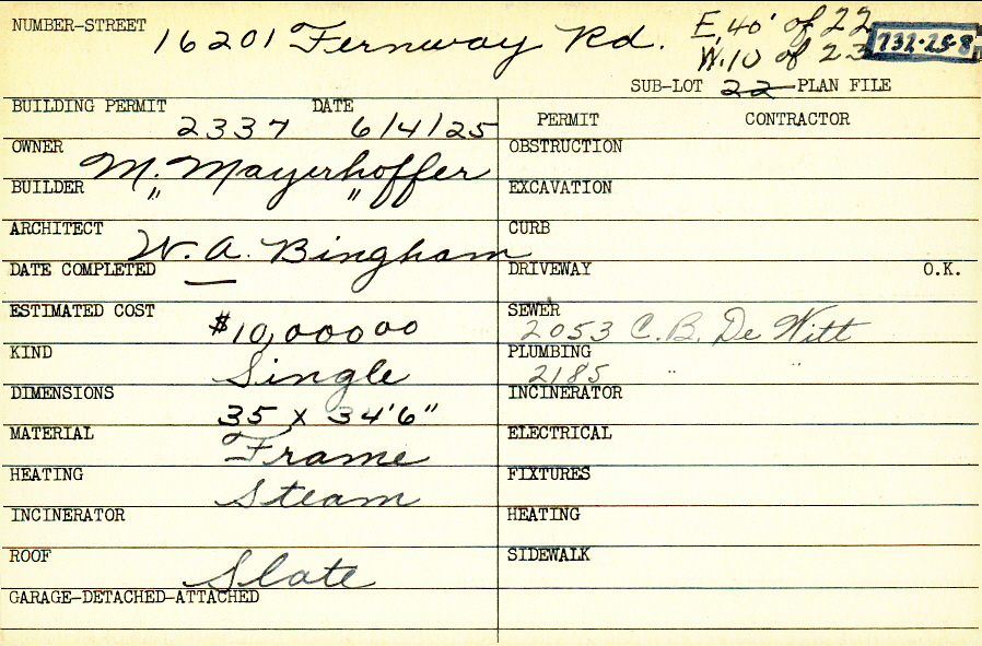 16201 Fernway Road Shaker Heights, OH 44120 PARCEL ID: 732-25-008 Building Permit Date: 06-04-1925 Plan File Number: 0 Neighborhood: Onaway Owner: Mayerhoffer, M. Builder: Mayerhoffer, M. Architect: Bingham, William A. Estimated Cost: 10000 Kind: Single, Single Residence or Dwelling Material: Frame Heating: Steam Roof: Slate |