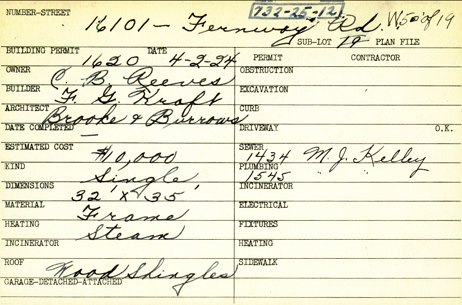 16101 Fernway Road Shaker Heights, OH 44120 PARCEL ID: 732-25-012 Building Permit Date: 04-02-1924 Plan File Number: 12065, 93-4* Microfilm Roll: NewRoll#11, NewRoll#16 Neighborhood: Onaway Owner: Reeves, C. B. Builder: Kraft, F. G. Architect: Brooke and Burrows Estimated Cost: 10000 Kind: Single, Single Residence or Dwelling Material: Frame Heating: Steam Roof: Wood Shingle |