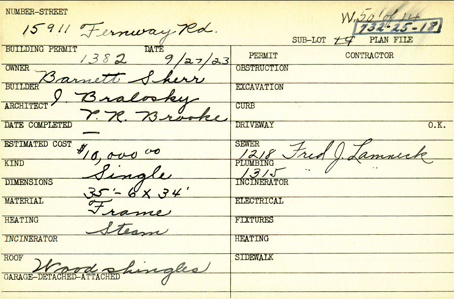 15911 Fernway Road Shaker Heights, OH 44120 PARCEL ID: 732-25-018 Building Permit Date: 09-27-1923 Plan File Number: 0 Neighborhood: Onaway Owner: Sherr, Barnett Builder: Bralosky, J. Architect: Brooke, Philo R. Estimated Cost: 10000 Kind: Single, Single Residence or Dwelling Material: Frame Heating: Steam Roof: Wood Shingle |