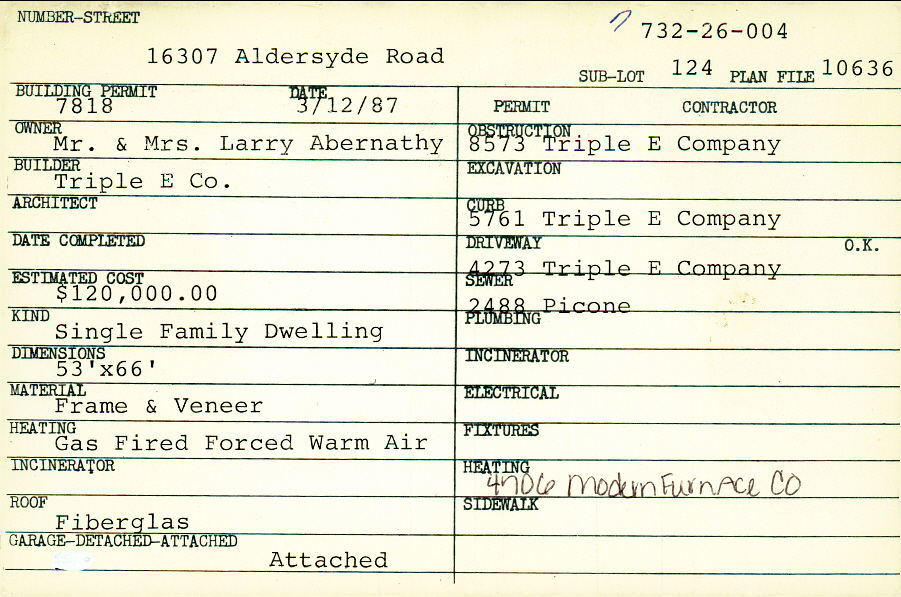16307 Aldersyde Drive Shaker Heights, OH 44120 PARCEL ID: 732-26-004 Building Permit Date: 03-12-1987 Plan File Number: 10636 Microfilm Roll: NewRoll#5 Neighborhood: Onaway Owner: Abernathy, Mr. and Mrs. Larry Builder: Triple E Company Estimated Cost: 120000 Kind: Single, Single Residence or Dwelling Material: Frame and Veneer Heating: Forced Air - Gas Roof: Fiberglas Garage: attached |  |