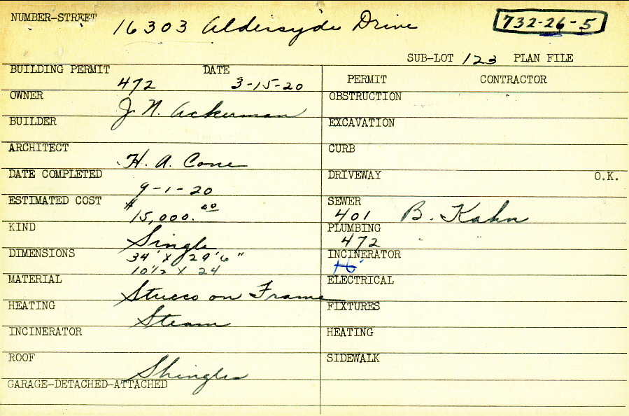 16303 Aldersyde Drive Shaker Heights, OH 44120- PARCEL ID: 732-26-005 Building Permit Date: 03-15-1920 Plan File Number: 10250 Microfilm Roll: NewRoll#3 Neighborhood: Onaway Owner: Ackerman, Joseph Nathan Architect: Cone, Harry A. Estimated Cost: 15000 Date Completed: 09-01-1920 Kind: Single, Single Residence or Dwelling Material: Stucco on Frame Heating: Steam Roof: Shingles |  |