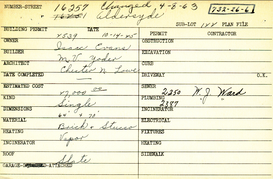 16257 Aldersyde Drive Shaker Heights, OH 44120- PARCEL ID: 732-26-006 Building Permit Date: 10-14-1925 Plan File Number: 5873 Microfilm Roll: Roll#79 Neighborhood: Onaway Owner: Evans, Isaac Builder: Yoder, M. V. Architect: Lowe, Chester N. Estimated Cost: 27000 Kind: Single, Single Residence or Dwelling Material: Brick and Stucco Heating: Vapor Roof: Slate Garage: attached |  |