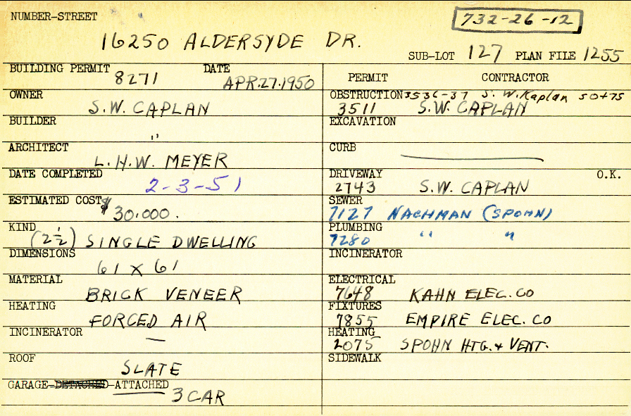 16250 Aldersyde Drive Shaker Heights, OH 44120 PARCEL ID: 732-26-012 Building Permit Date: 04-27-1950 Plan File Number: 1255 all scanned Microfilm Roll: Roll015 Neighborhood: Onaway Owner: Caplan, S. W. Builder: Caplan, S. W. Architect: Meyer, L. H. W. Estimated Cost: 30000 Date Completed: 02-03-1951 Kind: Single, Single Residence or Dwelling (2) Material: Brick Veneer Heating: Forced Air Roof: Slate Garage: attached 3 car |  |
