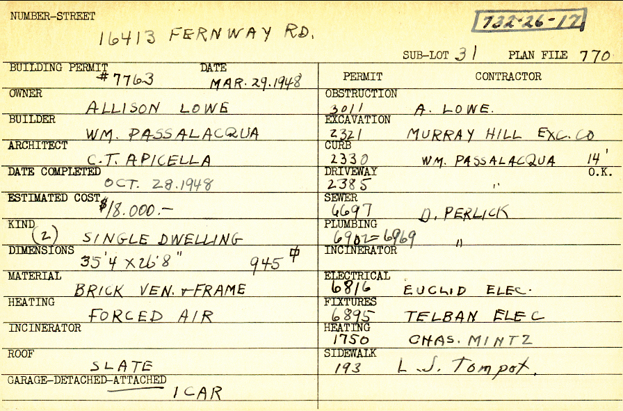 16413 Fernway Road Shaker Heights, OH 44120 PARCEL ID: 732-26-017 Building Permit Date: 03-29-1948 Plan File Number: 770 all scanned Microfilm Roll: Roll011 Neighborhood: Onaway Owner: Lowe, Allison Builder: Passalacqua, William Architect: Apicella, C. T. Estimated Cost: 18000 Date Completed: 10-28-1948 Kind: Single, Single Residence or Dwelling (2) Material: Brick Veneer and Frame Heating: Forced Air Roof: Slate Garage: attached |
