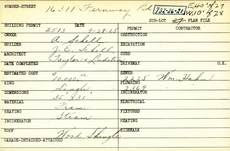 16311 Fernway Road Shaker Heights, OH 44120 PARCEL ID: 732-26-021 Building Permit Date: 09-28-1925 Plan File Number: 0 Neighborhood: Onaway Owner: Schell, A. Builder: Schell, J. E. Architect: Taylor and Lindstrom Estimated Cost: 10000 Kind: Single, Single Residence or Dwelling Material: Frame Heating: Steam Roof: Wood Shingle Card Available: yes |