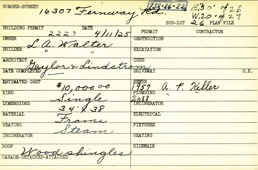 16307 Fernway Road Shaker Heights, OH 44120 PARCEL ID: 732-26-022 Building Permit Date: 04-11-1925 Plan File Number: 0 Neighborhood: Onaway Owner: Walter, L. A. Builder: Walter, L. A. Architect: Gaylor and Lindstrom Estimated Cost: 10000 Kind: Single, Single Residence or Dwelling Material: Frame Heating: Steam Roof: Wood Shingle Card Available: yes |