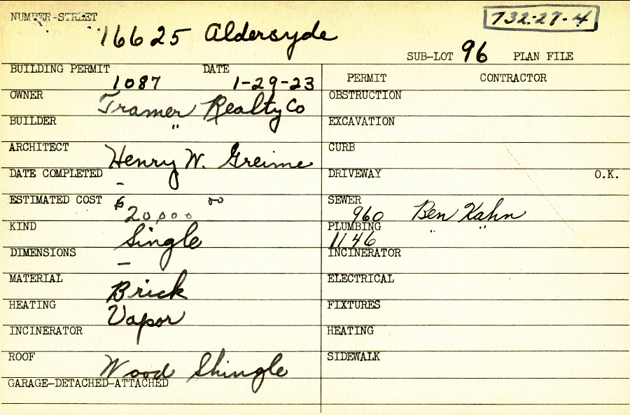 16625 Aldersyde Drive Shaker Heights, OH 44120 PARCEL ID: 732-27-004 Building Permit Date: 01-29-1923 Plan File Number: 5847, 5856 Microfilm Roll: Roll#79 Neighborhood: Fernway Owner: Tramer Realty Company Builder: Tramer Realty Company Architect: Grieme, Henry W. Estimated Cost: 20000 Kind: Single, Single Residence or Dwelling Material: Brick Heating: Vapor Roof: Wood Shingle |  |