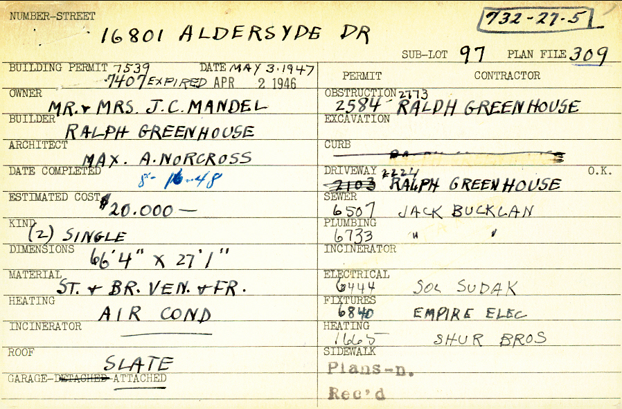 16801 Aldersyde Drive Shaker Heights, OH 44120 PARCEL ID: 732-27-005 Building Permit Date: 05-03-1947 Plan File Number: 309 scanned, 12326 Microfilm Roll: Roll004, NewRoll#12 Neighborhood: Fernway Owner: Mandel, Mr. and Mrs. J. C. Builder: Greenhouse, Ralph Architect: Norcross, Maxwell A. Estimated Cost: 20000 Date Completed: 08-16-1948 Kind: Single, Single Residence or Dwelling (2) Material: Stone and Brick Veneer and Frame Heating: Air Conditioned Roof: Slate Garage: attached |  |