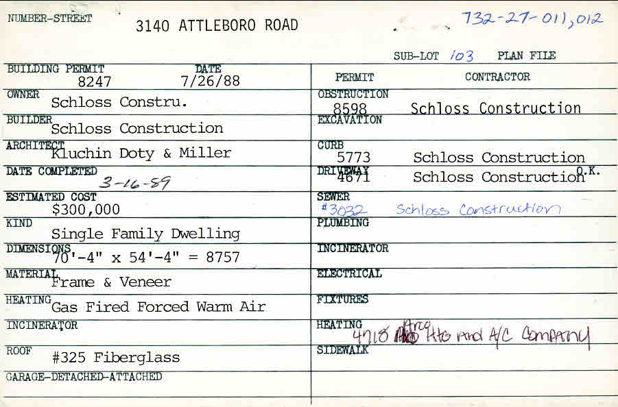 3140 Attleboro Road Shaker Heights, OH 44120 PARCEL ID: 732-27-011 Building Permit Date: 07-26-1988 Plan File Number: 11324* Microfilm Roll: NewRoll#7 Neighborhood: Fernway Owner: Schloss Construction Builder: Schloss Construction Architect: Kluchin Doty and Miller Estimated Cost: 300000 Date Completed: 03-16-1989 Kind: Single, Single Residence or Dwelling Material: Frame and Veneer Heating: Forced Air - Gas Roof: Fiberglas |