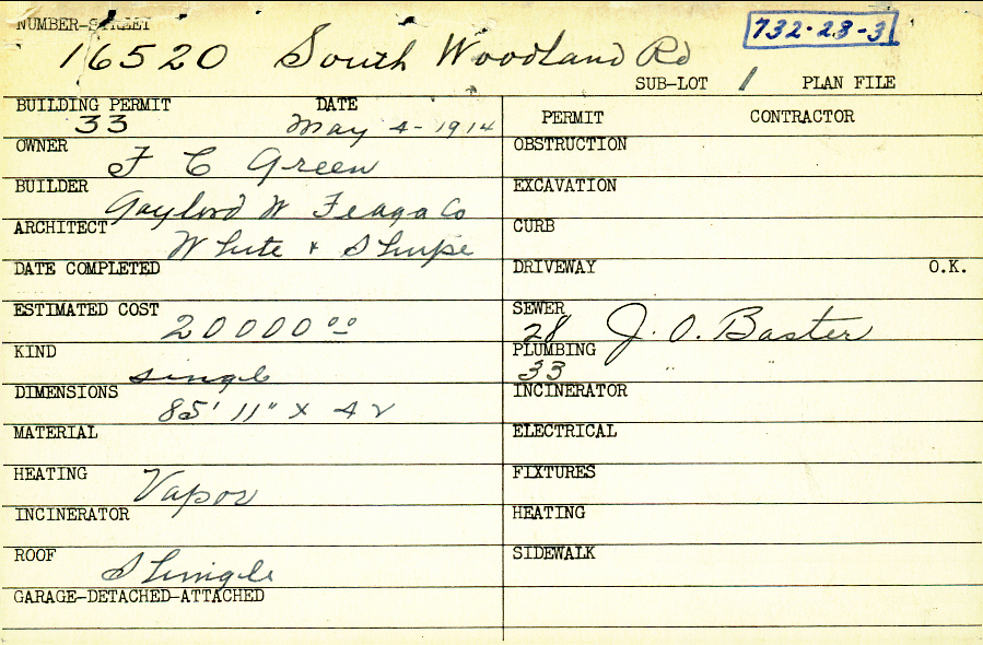 16520 South Woodland Road Shaker Heights, OH 44120 PARCEL ID: 732-28-003 Building Permit Date: 05-04-1914 Plan File Number: 0 Neighborhood: Boulevard Owner: Green, F.C. Builder: Gaylord W. Feaga Company Architect: White and Shupe Estimated Cost: 20000 Kind: Single, Single Residence or Dwelling Heating: Vapor Roof: Shingles Card Available: Yes |