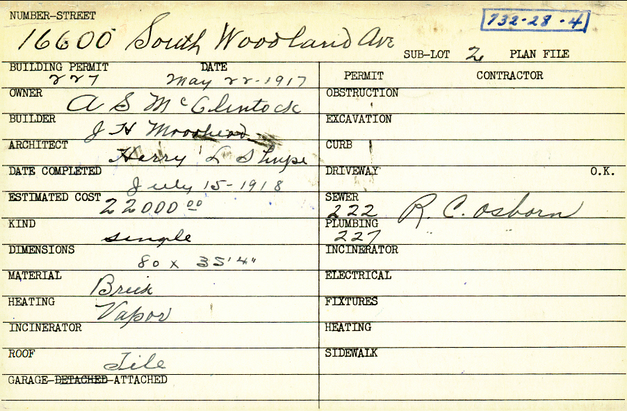 16600 South Woodland Road Shaker Heights, OH 44120 PARCEL ID: 732-28-004 Building Permit Date: 05-22-1917 Plan File Number: 0 Neighborhood: Boulevard Owner: McClintock, A. S. Builder: Moorhead, J. H. Architect: Shupe, Harry L. Estimated Cost: 22000 Date Completed: 07-15-1918 Kind: Single, Single Residence or Dwelling Material: Brick Heating: Vapor Roof: Tile Garage: attached Card Available: yes |