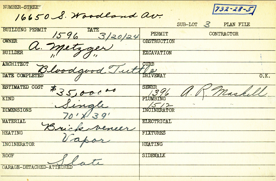 16650 South Woodland Road Shaker Heights, OH 44120 PARCEL ID: 732-28-005 Building Permit Date: 03-20-1924 Plan File Number: 12185 Microfilm Roll: NewRoll#11 Neighborhood: Boulevard Owner: Metzger, A. Builder: Metzger, A. Architect: Tuttle, Bloodgood Estimated Cost: 35000 Kind: Single, Single Residence or Dwelling Material: Brick Veneer Heating: Vapor Roof: Slate |