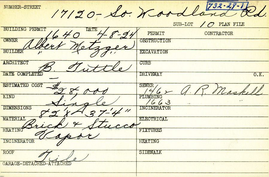 17120 South Woodland Road Shaker Heights, OH 44120 PARCEL ID: 732-29-001 Building Permit Date: 04-08-1924 Plan File Number: 0 Owner: Metzger, Albert Builder: Metzger, Albert Architect: Tuttle, Bloodgood Estimated Cost: 28000 Kind: Single, Single Residence or Dwelling Material: Brick and Stucco Heating: Vapor Roof: Tile |