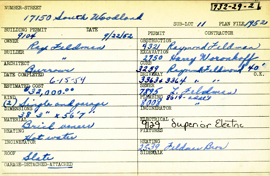 17150 South Woodland Road Shaker Heights, OH 44120 PARCEL ID: 732-29-002 Building Permit Date: 09-22-1952 Plan File Number: 1952 Microfilm Roll: Roll#29 Neighborhood: Boulevard Owner: Feldman, Ray Builder: Feldman, Ray Architect: Burrows Estimated Cost: 32000 Date Completed: 06-15-1954 Kind: Single Dwelling and Garage (2) Material: Brick Veneer Heating: Hot Water Roof: Slate Garage: attached |
