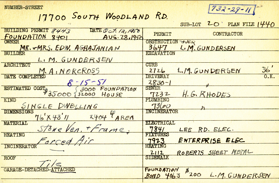 17700 South Woodland Road Shaker Heights, OH 44120 PARCEL ID: 732-29-011 Building Permit Date: 08-28-1950 Plan File Number: 1109, 1440 all scanned Microfilm Roll: Roll013, Roll016 Neighborhood: Malvern Owner: Aghajanian, Mr. and Mrs. Edward Builder: Gundersen, L. M. Architect: Norcross, M. A. Estimated Cost: 35000 Date Completed: 08-15-1951 Kind: Single, Single Residence or Dwelling Material: Stone Veneer and Frame Heating: Forced Air Roof: Tile Garage: attached |