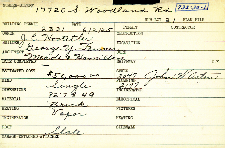 17720 South Woodland Road Shaker Heights, OH 44120 PARCEL ID: 732-30-001 Building Permit Date: 06-02-1925 Plan File Number: 10786 Microfilm Roll: NewRoll#5 Neighborhood: Malvern Owner: Hostetler, J. C. Builder: Farmer, George Y. Architect: Meade and Hamilton Estimated Cost: 50000 Kind: Single, Single Residence or Dwelling Material: Brick Heating: Vapor Roof: Slate |