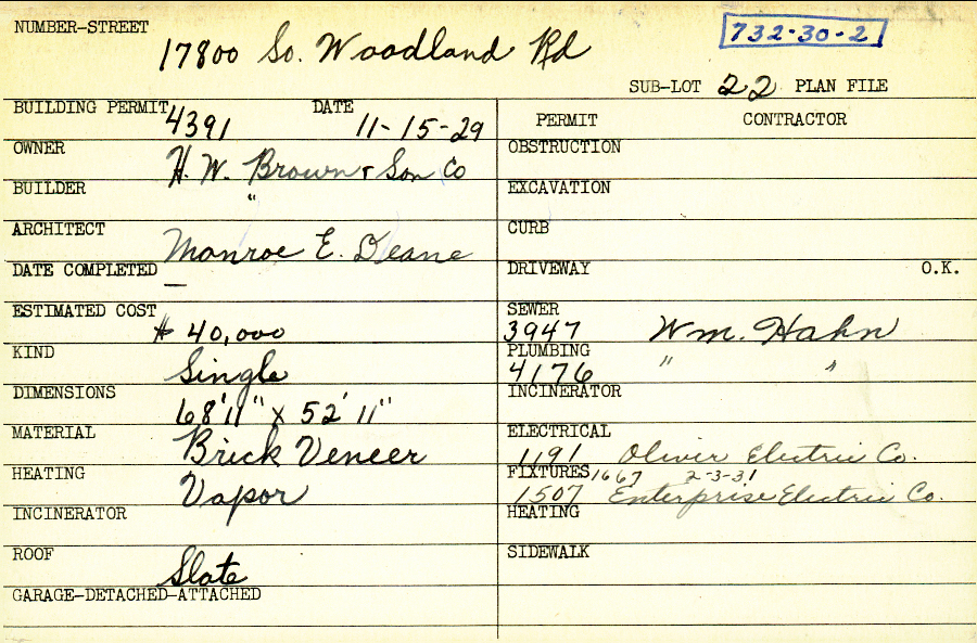 17800 South Woodland Road Shaker Heights, OH 44120 PARCEL ID: 732-30-002 Building Permit Date: 11-15-1929 Plan File Number: 0 Neighborhood: Malvern Owner: H. W. Brown and Son Company Builder: H. W. Brown and Son Company Architect: Deane, Monroe Ensign Estimated Cost: 40000 Kind: Single, Single Residence or Dwelling Material: Brick Veneer Heating: Vapor Roof: Slate |