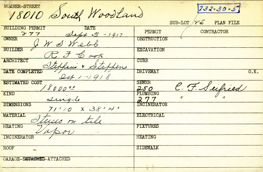 18010 South Woodland Road Shaker Heights, OH 44120 PARCEL ID: 732-30-005 Building Permit Date: 09-05-1917 Plan File Number: 0 Neighborhood: Malvern Owner: Webb, J. W. S. Builder: Cook, R. F. Architect: Steffens and Steffens Estimated Cost: 18000 Date Completed: 10-01-1918 Kind: Single, Single Residence or Dwelling Material: Stucco on Tile Heating: Vapor Garage: attached Card Available: yes |