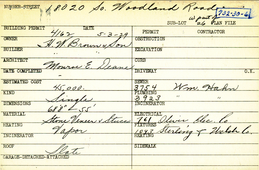 18020 South Woodland Road Shaker Heights, OH 44120 PARCEL ID: 732-30-006 Building Permit Date: 05-03-1929 Plan File Number: 0 Neighborhood: Malvern Owner: H. W. Brown and Son Builder: H. W. Brown and Son Architect: Deane, Monroe Ensign Estimated Cost: 45000 Kind: Single, Single Residence or Dwelling Material: Stone Veneer and Stucco Heating: Vapor Roof: Slate |