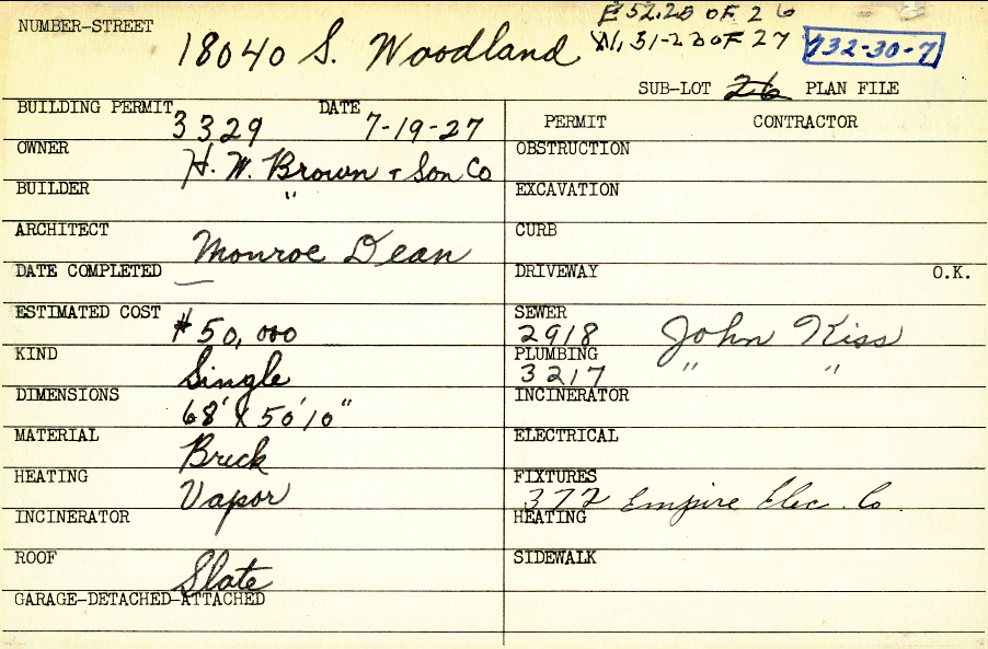18040 South Woodland Road Shaker Heights, OH 44120 PARCEL ID: 732-30-007 Building Permit Date: 07-19-1927 Plan File Number: 9713 Microfilm Roll: Roll#104 Neighborhood: Malvern Owner: H. W. Brown and Son Company Builder: H. W. Brown and Son Company Architect: Dean, Monroe Estimated Cost: 50000 Kind: Single, Single Residence or Dwelling Material: Brick Heating: Vapor Roof: Slate |