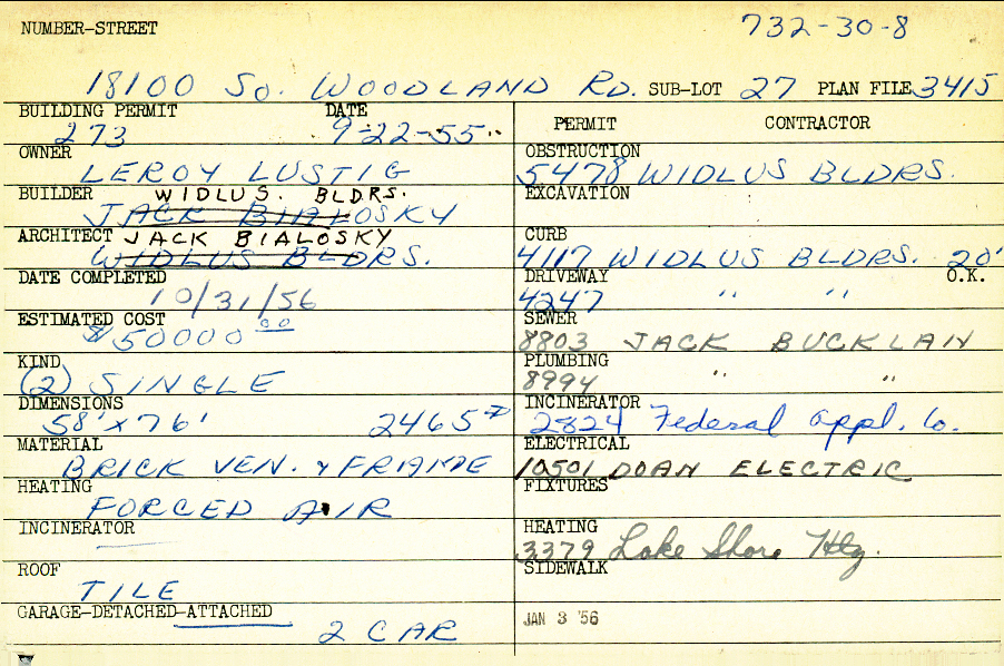 18100 South Woodland Road Shaker Heights, OH 44120 PARCEL ID: 732-30-008 Building Permit Date: 09-22-1955 Plan File Number: 3415, 4610, 7656, 7689 Microfilm Roll: Roll#65, Roll#94 Neighborhood: Malvern Owner: Lustig, Leroy Builder: Widlus Builders Architect: Bialosky, Jack A. Estimated Cost: 50000 Date Completed: 10-31-1956 Kind: Single, Single Residence or Dwelling (2) Material: Brick Veneer and Frame Heating: Forced Air Roof: Tile Garage: attached 2 car |