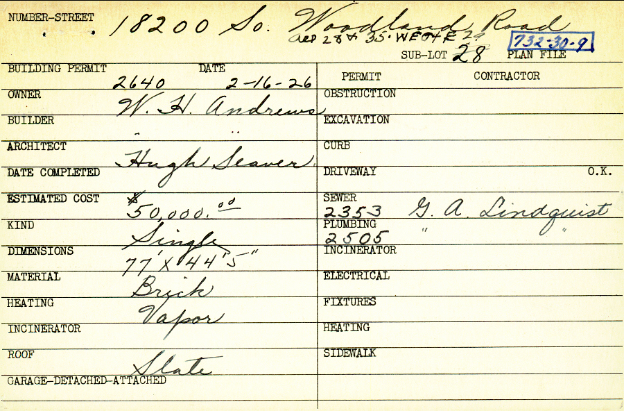 18200 South Woodland Road Shaker Heights, OH 44120 PARCEL ID: 732-30-009 Building Permit Date: 02-16-1926 Plan File Number: 9262 Microfilm Roll: Roll#102 Neighborhood: Malvern Owner: Andrews, W. H. Builder: Andrews, W. H. Architect: Seaver, Hugh Estimated Cost: 50000 Kind: Single, Single Residence or Dwelling Material: Brick Heating: Vapor Roof: Slate |