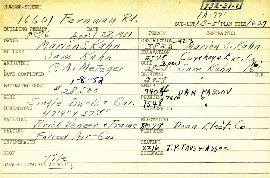 16601 Fernway Road Shaker Heights, OH 44120 PARCEL ID: 732-31-001 Building Permit Date: 04-28-1951 Plan File Number: 1627, 5075, 5875 all scanned Microfilm Roll: Roll025, Roll069, Roll079 Neighborhood: Fernway Owner: Kahn, Marion S. Builder: Kahn, Sam Architect: Metzger, C. A. Estimated Cost: 28500 Date Completed: 01-08-1952 Kind: Single Dwelling and Garage Material: Brick Veneer and Frame Heating: Forced Air - Gas Roof: Tile Garage: attached Blueprints: online, see link above |