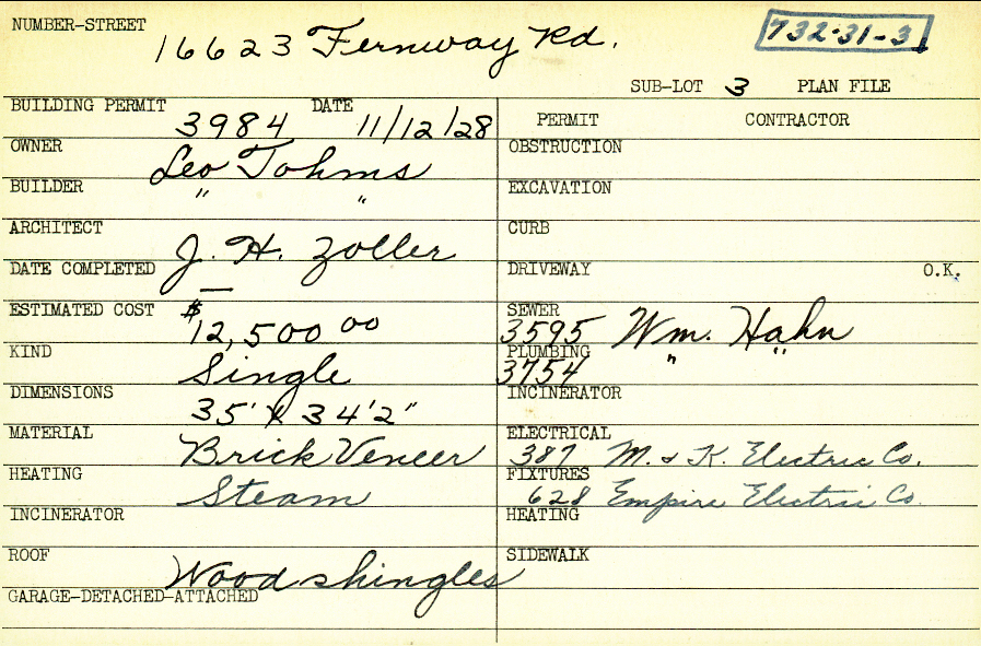 16623 Fernway Road Shaker Heights, OH 44120 PARCEL ID: 732-31-003 Building Permit Date: 11-12-1928 Plan File Number: 0 Neighborhood: Fernway Owner: Tohms, Leo Builder: Tohms, Leo Architect: Zoller, J. H. Estimated Cost: 12500 Kind: Single, Single Residence or Dwelling Material: Brick Veneer Heating: Steam Roof: Wood Shingle Card Available: yes |