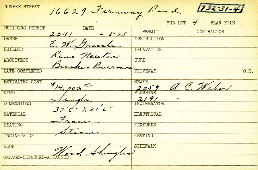 16629 Fernway Road Shaker Heights, OH 44120 PARCEL ID: 732-31-004 Building Permit Date: 06-08-1925 Plan File Number: 5089 Microfilm Roll: Roll#69 Neighborhood: Fernway Owner: Grissle, E. W. Builder: Neuter, Reno Architect: Brooke and Burrows Estimated Cost: 14000 Kind: Single, Single Residence or Dwelling Material: Frame Heating: Steam Roof: Wood Shingle |