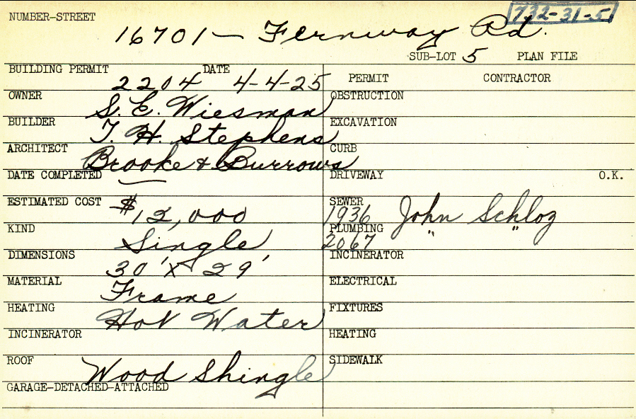 16701 Fernway Road Shaker Heights, OH 44120 PARCEL ID: 732-31-005 Building Permit Date: 04-04-1925 Plan File Number: 4720 all scanned Microfilm Roll: Roll065 Neighborhood: Fernway Owner: Wiesman, S. E. Builder: Stephens, T. H. Architect: Brooke and Burrows Estimated Cost: 12000 Kind: Single, Single Residence or Dwelling Material: Frame Heating: Hot Water Roof: Wood Shingle Blueprints: online, see link above |