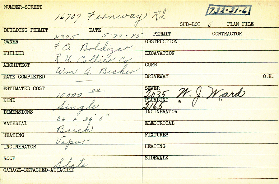 16707 Fernway Road Shaker Heights, OH 44120 PARCEL ID: 732-31-006 Building Permit Date: 05-20-1925 Plan File Number: 0 Neighborhood: Fernway Owner: Boldizar, F. E. Builder: Collier, R. U. Architect: Becker, William A. Estimated Cost: 15000 Kind: Single, Single Residence or Dwelling Material: Brick Heating: Vapor Roof: Slate Card Available: yes |