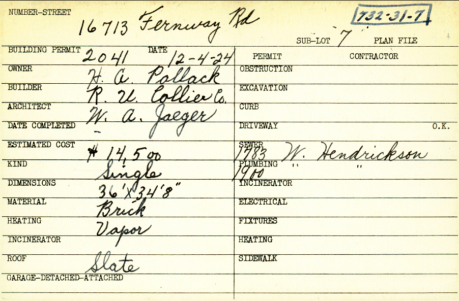 16713 Fernway Road Shaker Heights, OH 44120 PARCEL ID: 732-31-007 Building Permit Date: 12-04-1924 Plan File Number: 0 Neighborhood: Fernway Owner: Pollack, H. A. Builder: R. U. Collier Company Architect: Jaeger, W. A. Estimated Cost: 14500 Kind: Single, Single Residence or Dwelling Material: Brick Heating: Vapor Roof: Slate Card Available: yes |