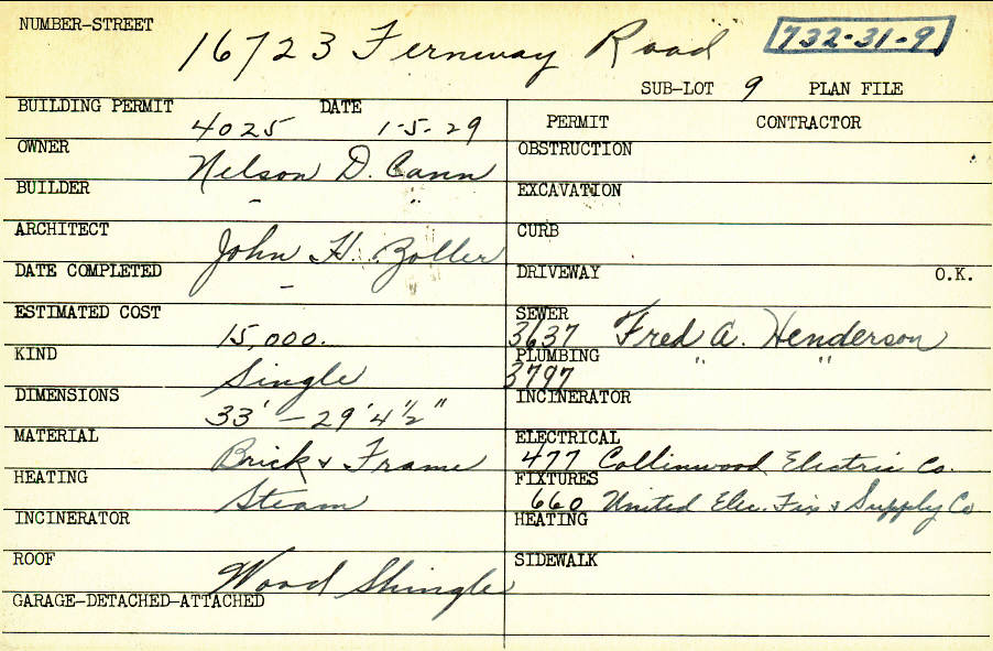 16723 Fernway Road Shaker Heights, OH 44120 PARCEL ID: 732-31-009 Building Permit Date: 01-05-1929 Plan File Number: 0 Neighborhood: Fernway Owner: Cann, Nelson D. Builder: Cann, Nelson D. Architect: Zoller, John H. Estimated Cost: 15000 Kind: Single, Single Residence or Dwelling Material: Brick and Frame Heating: Steam Roof: Wood Shingle Card Available: yes |