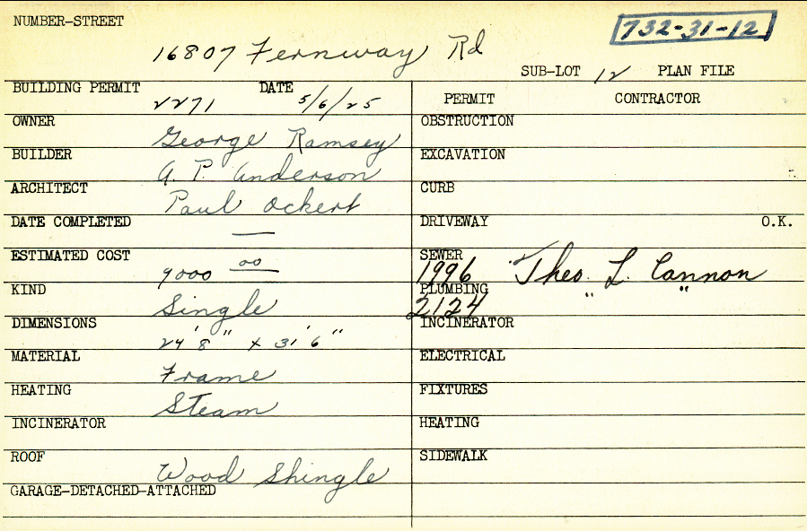 16807 Fernway Road Shaker Heights, OH 44120 PARCEL ID: 732-31-012 Building Permit Date: 05-06-1925 Plan File Number: 0 Neighborhood: Fernway Owner: Ramsey, George Builder: Anderson, A. P. Architect: Ockert, Paul Estimated Cost: 9000 Kind: Single, Single Residence or Dwelling Material: Frame Heating: Steam Roof: Wood Shingle Card Available: yes |