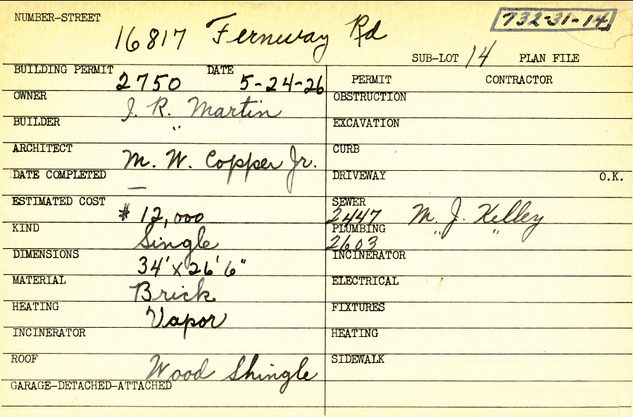 16817 Fernway Road Shaker Heights, OH 44120 PARCEL ID: 732-31-014 Building Permit Date: 05-24-1926 Plan File Number: 6610 Microfilm Roll: Roll#87 Neighborhood: Fernway Owner: Martin, J. R. Builder: Martin, J. R. Architect: Copper, Munroe Walker Jr. Estimated Cost: 12000 Kind: Single, Single Residence or Dwelling Material: Brick Heating: Vapor Roof: Wood Shingle |