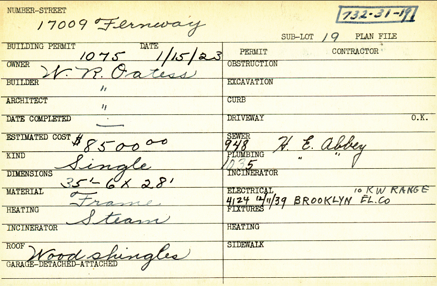 17009 Fernway Road Shaker Heights, OH 44120 PARCEL ID: 732-31-019 Building Permit Date: 01-15-1923 Plan File Number: 0 Neighborhood: Fernway Owner: Oatess, W. R. Builder: Oatess, W. R. Architect: Oatess, W. R. Estimated Cost: 8500 Kind: Single, Single Residence or Dwelling Material: Frame Heating: Steam Roof: Wood Shingle Card Available: yes |