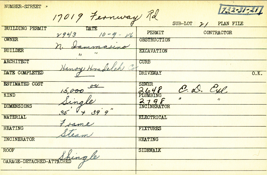 17019 Fernway Road Shaker Heights, OH 44120 PARCEL ID: 732-31-021 Building Permit Date: 10-09-1926 Plan File Number: 1706 all scanned Microfilm Roll: Roll026 Neighborhood: Fernway Owner: Iammarino, N. Builder: Iammarino, N. Architect: Henry Hvadeleh Company Estimated Cost: 15000 Kind: Single, Single Residence or Dwelling Material: Frame Heating: Steam Roof: Shingles |