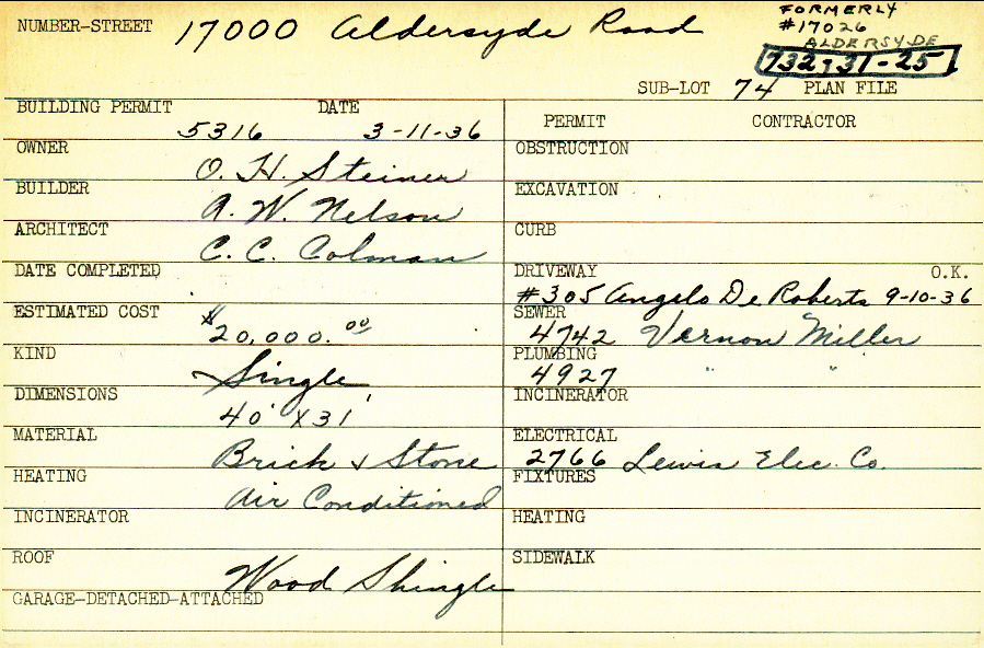 17000 Aldersyde Drive Shaker Heights, OH 44120 PARCEL ID: 732-31-025 Building Permit Date: 03-11-1936 Plan File Number: 0 Neighborhood: Fernway Owner: Steiner, O. H. Builder: Nelson, A. W. Architect: Colman, Charles C. Estimated Cost: 20000 Kind: Single, Single Residence or Dwelling Material: Brick and Stone Heating: Air Conditioned Roof: Wood Shingle |  |