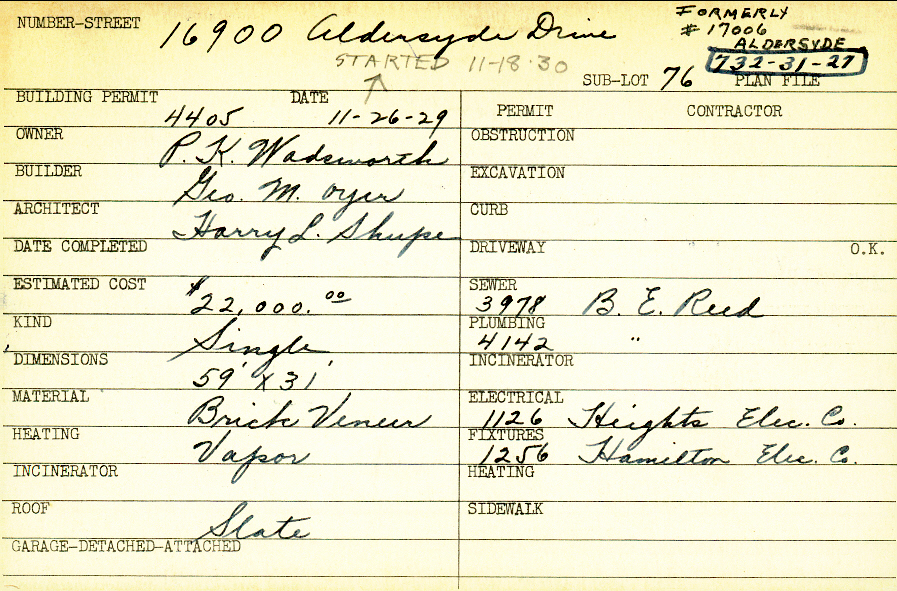 16900 Aldersyde Drive Shaker Heights, OH 44120 PARCEL ID: 732-31-027 Building Permit Date: 11-26-1929 Plan File Number: 0 Neighborhood: Fernway Owner: Wadsworth, P. K. Builder: Oyer, George M. Architect: Shupe, Harry L. Estimated Cost: 22000 Kind: Single, Single Residence or Dwelling Material: Brick Veneer Heating: Vapor Roof: Slate |  |