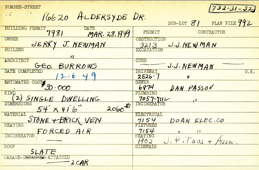 16620 Aldersyde Drive Shaker Heights, OH 44120 PARCEL ID: 732-31-032 Building Permit Date: 03-28-1949 Plan File Number: 992 all scanned Microfilm Roll: Roll012 Neighborhood: Fernway Owner: Newman, Jerry J. Builder: Newman, Jerry J. Architect: Burrows, George Estimated Cost: 30000 Date Completed: 12-06-1949 Kind: Single, Single Residence or Dwelling (2) Material: Stone and Brick Veneer Heating: Forced Air Roof: Slate Garage: attached 2 car |  |