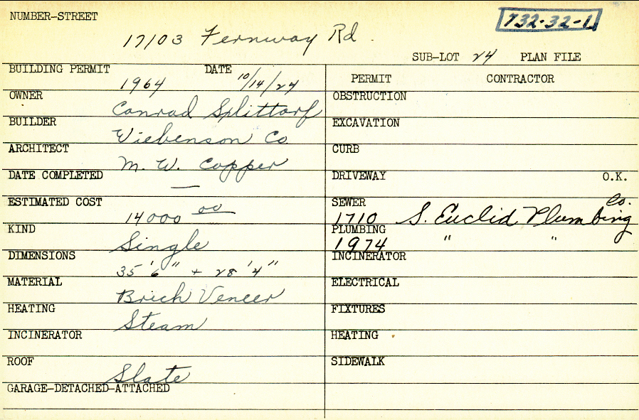 17103 Fernway Road Shaker Heights, OH 44120 PARCEL ID: 732-32-001 Building Permit Date: 10-14-1924 Plan File Number: 0 Neighborhood: Fernway Owner: Splittorf, Conrad Builder: Wiebenson Company Architect: Copper, Munroe Walker Jr. Estimated Cost: 14000 Kind: Single, Single Residence or Dwelling Material: Brick Veneer Heating: Steam Roof: Slate |